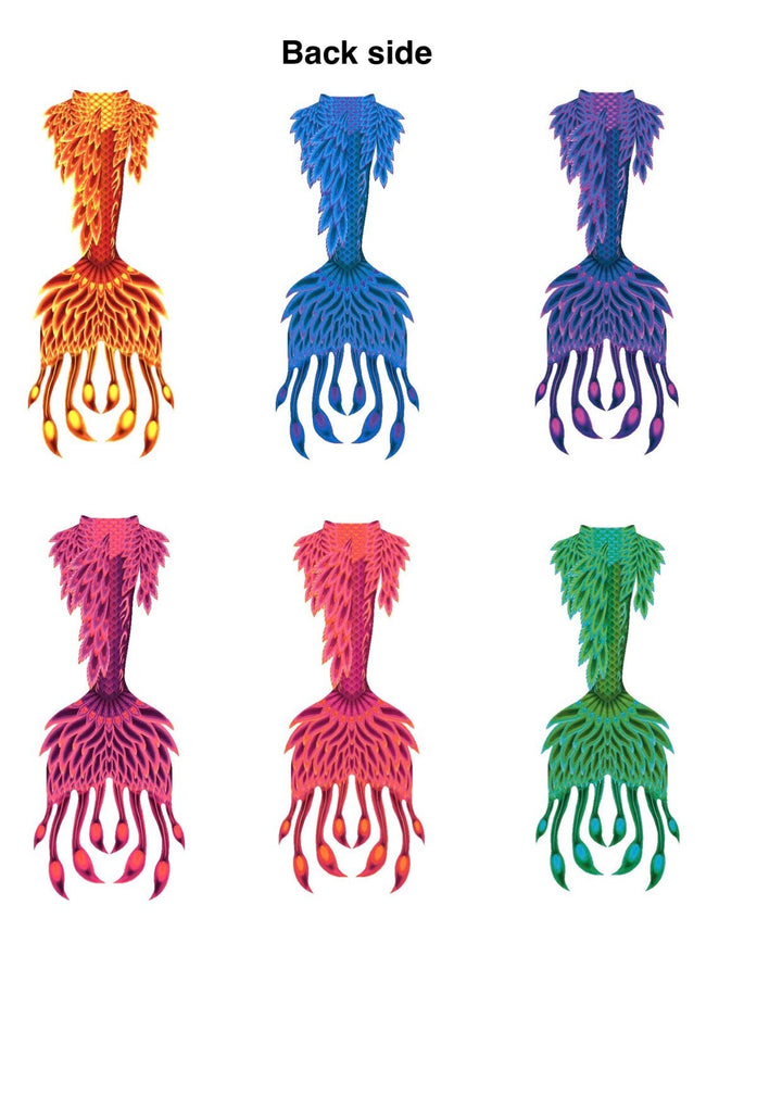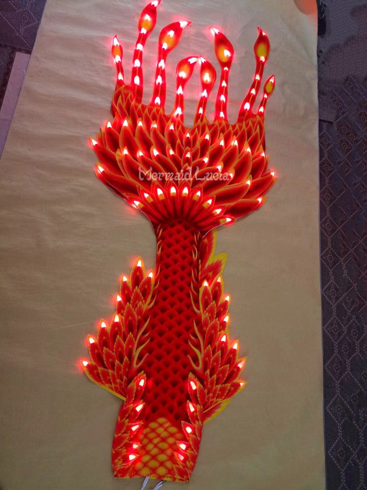 This is an epic LED multi-layer fabric tail consisting of 6 layers in total (3 on the front and 3 on the back). One tail uses approximately 10 square metres of printed fabric made into layers to create a tiered effect that looks spectacular when suspended in water. Each tail contains 192 LEDs (not including those on the bra).