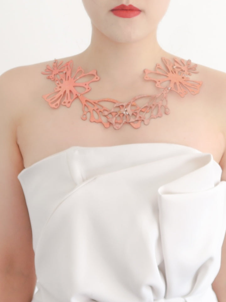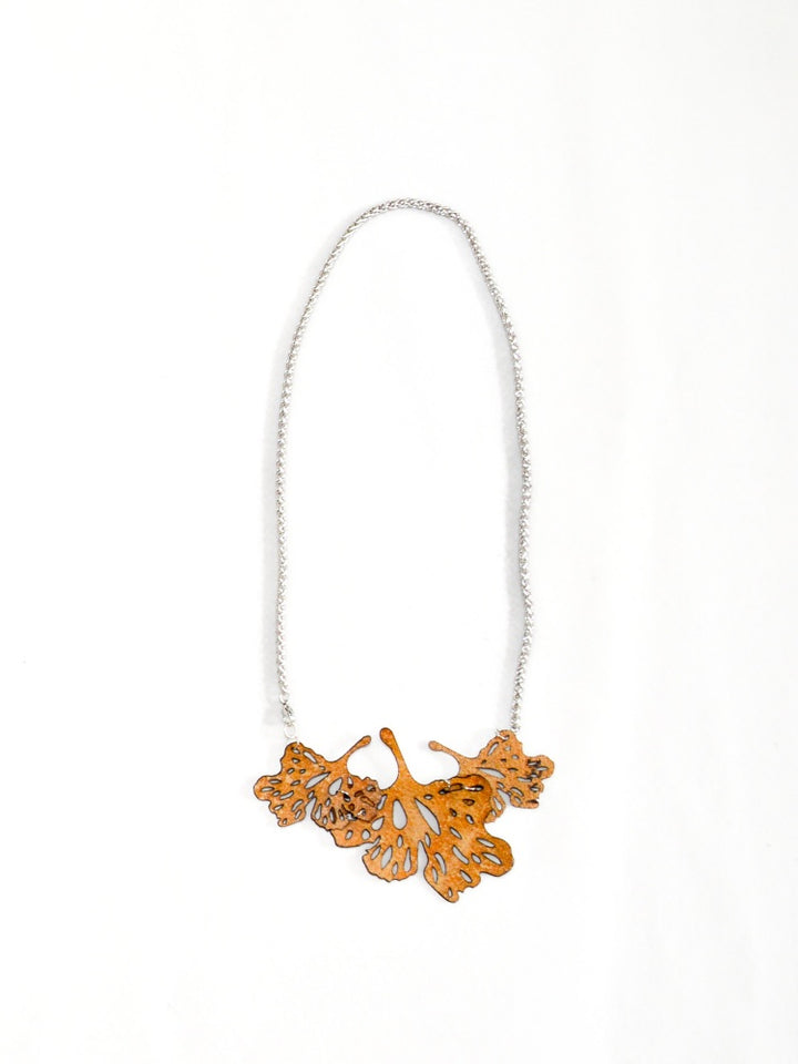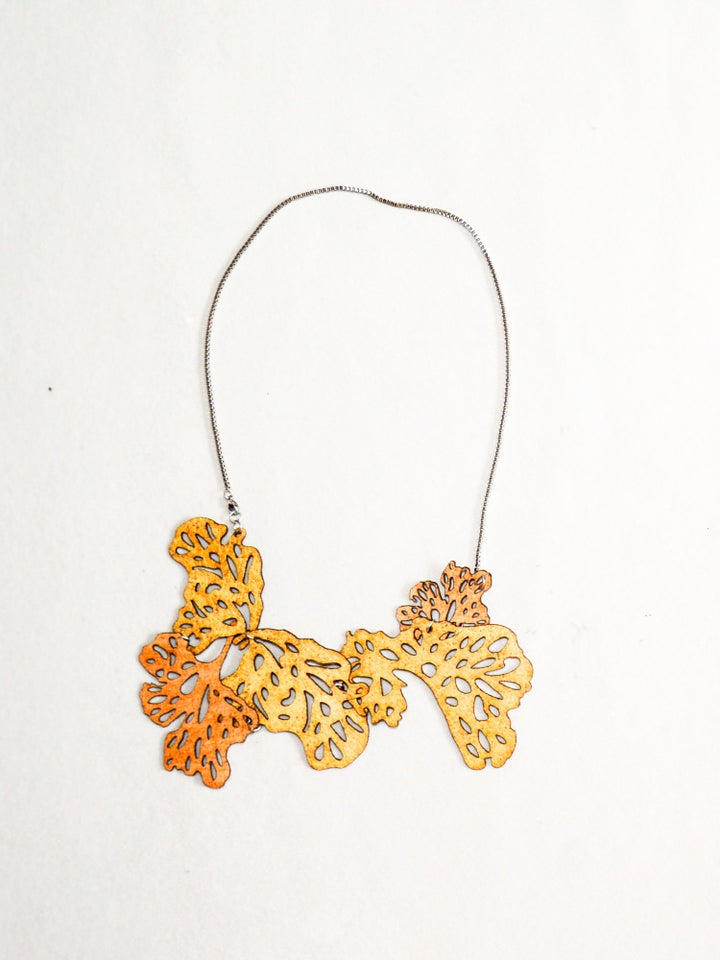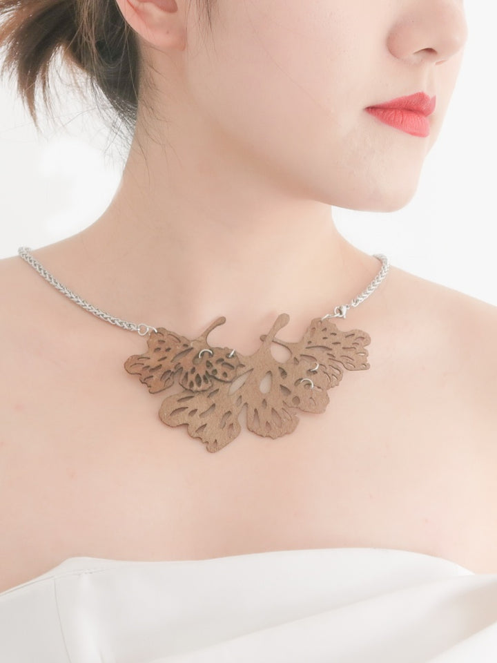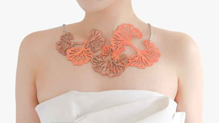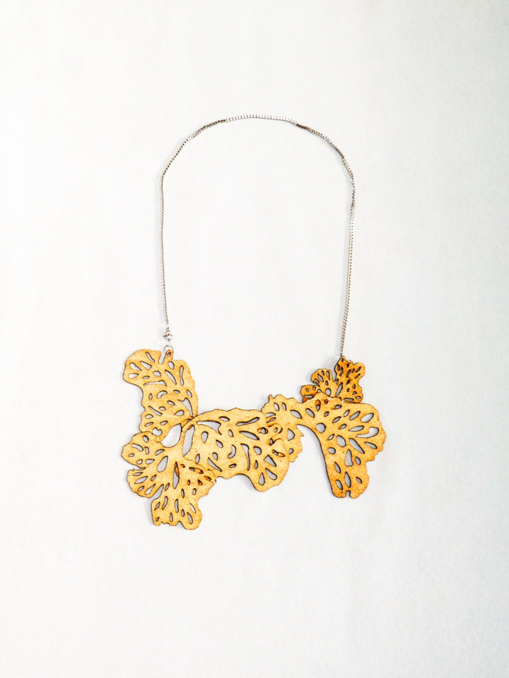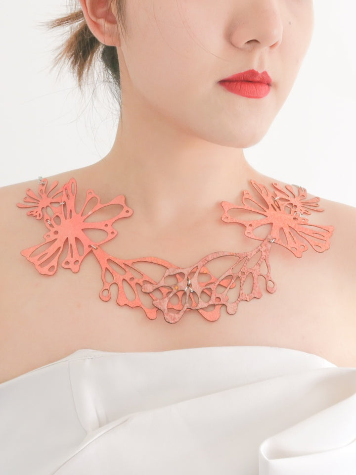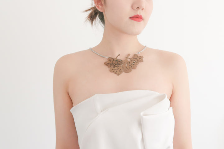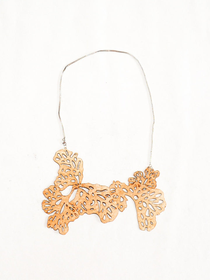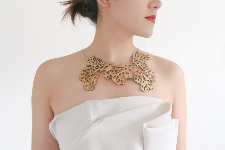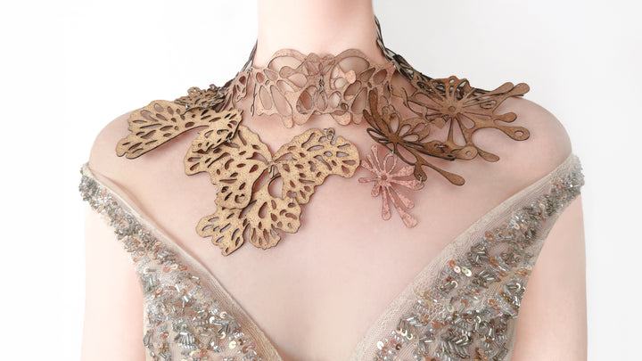 This unique necklace is crafted from innovative mushroom leather, a pioneering eco-friendly material that combines beauty, durability, and responsibility to the planet. Each design is registered with a UK Design Patent, ensuring exclusivity and artistry in every piece.
